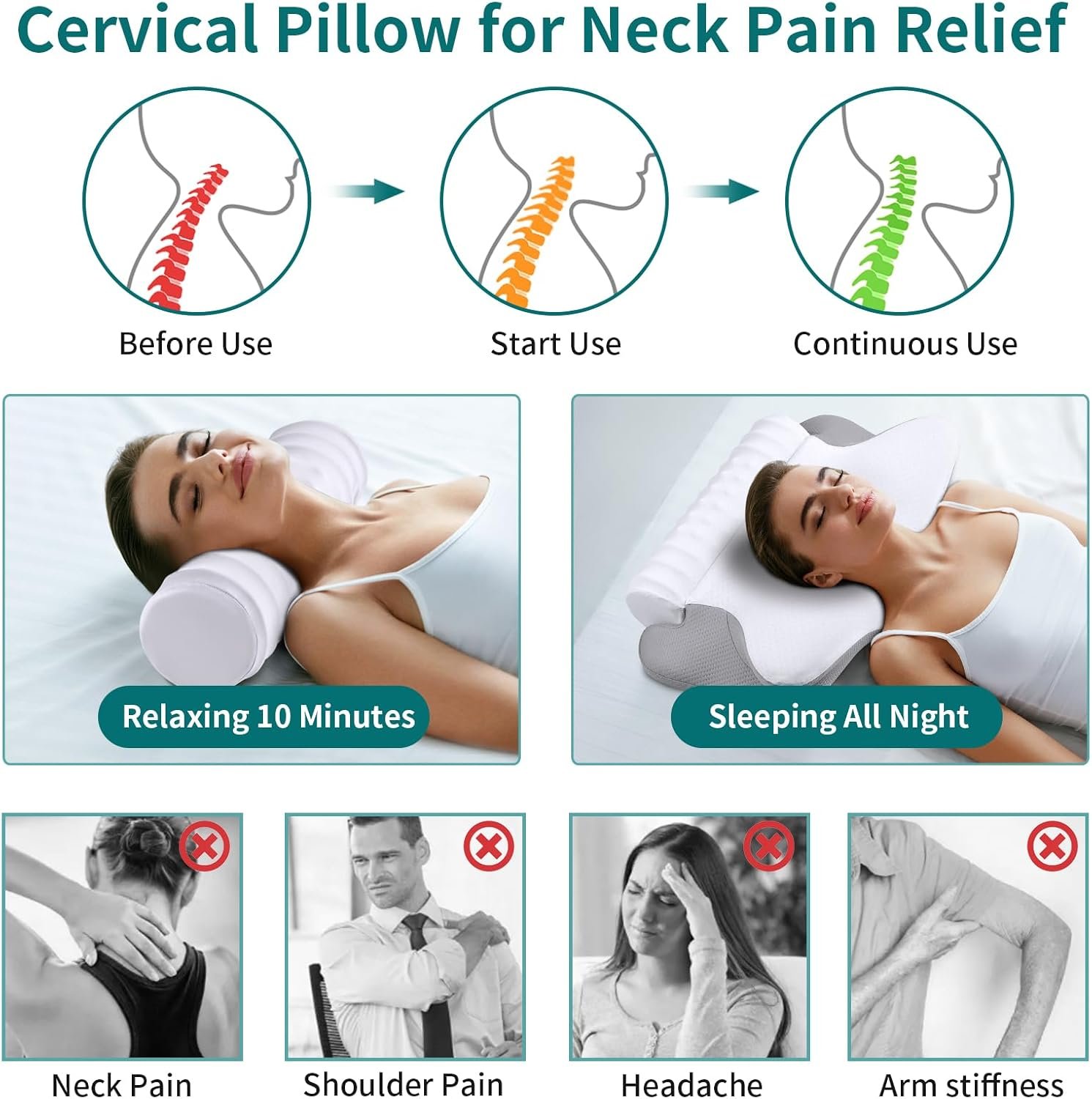Safe Memory Foam Pillow: The pillow measures 23 x 15.5 x 5.5 inches(length x width x height); the roll pillow section is 16.9 x 4.7 inches(length x height)The neck pillow is made of slow rebound memory foam that is safe and non-toxic, long-term use is not easy to collapse. The cervical pillow is ergonomically designed with different heights and shapes to suit the natural curvature of the spine, providing targeted support for your head and neck and promoting spinal alignment. The ergonomic pillow enables you to fall into a deep sleep rapidly and comfortably and you will no longer be troubled by neck pain upon waking up