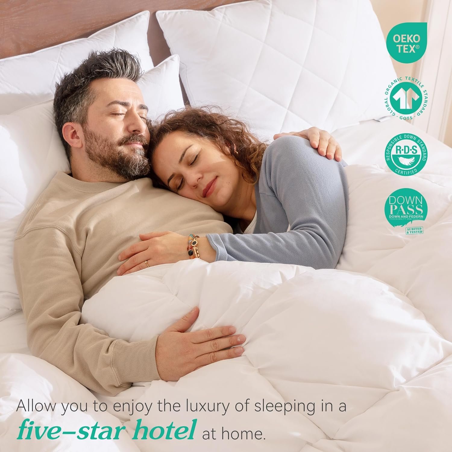COTTON COVER-Finely sewn of a soft and smooth 600-thread-count cotton shell .down-proof and Oeko-Tex certified to be absolutely free of harmful chemicals.
